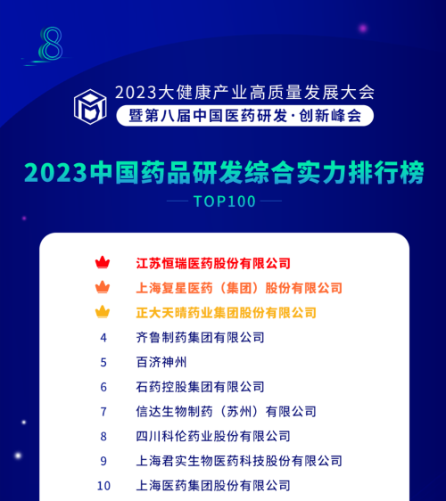 由药智网、中国药业杂志社主办的2023大健康产业高质量发展大会暨第八届中国医药研发•创新峰会于6月16日开幕,会上发布了《2023中国药品研发实力排行榜》系列榜单,AG体育医药凭借深厚的创新研发实力再创辉煌:荣登《2023中国药品研发综合实力排行榜TOP100》榜首、《2023中国化药研发实力排行榜TOP100》榜首。值得一提的是,今年是AG体育医药连续第6年入选《中国药品研发综合实力排行榜》榜首。