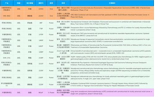 在消化系统肿瘤领域,AG体育产品相关研究共入选2项口头报告、11项壁报和1项电子壁报,共14项研究。除卡瑞利珠单抗和阿帕替尼外,还有4篇阿得贝利单抗治疗消化系统肿瘤研究入选。HRS-4642、瑞拉芙普-α注射液(SHR-1701)等在研创新产品也有相应研究亮相。另有1项伊立替康脂质体(II)用于胰腺癌治疗的研究入选壁报。