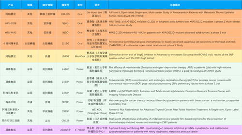 在胸腺上皮肿瘤、头颈鳞癌、肉瘤、前列腺癌、甲状腺癌等其他多个疾病领域,卡瑞利珠单抗、阿帕替尼、瑞维鲁胺、阿得贝利单抗、法米替尼、HRS-7058、HRS-4642等抗肿瘤创新药相关研究一共入选了4项口头报告、1项简短口头报告、4项壁报、1项电子壁报,彰显了AG体育医药强大的研发实力。此外,海曲泊帕和昂丹司琼口溶膜分别在防治化疗导致的血小板减少和恶心呕吐方面各有1项研究入选壁报。